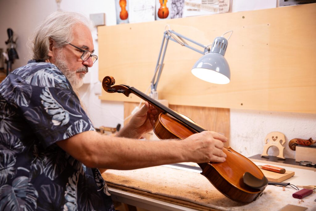 Geigenbaumeister Otto Felix Kruppa ist bei uns für alle technischen Fragen zum Geigenbau zuständig. Sein Reich ist die Werkstatt, in der er nicht nur VIOLINEO-Instrumente spielfertig einrichtet und klanglich optimiert, sondern auch Reparaturen und Wartungsarbeiten durchführt.
